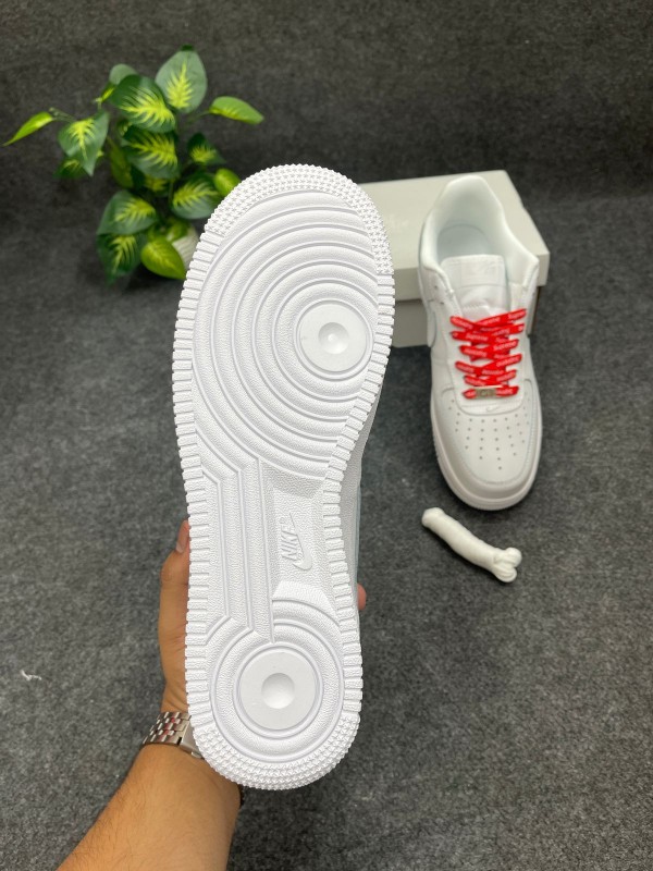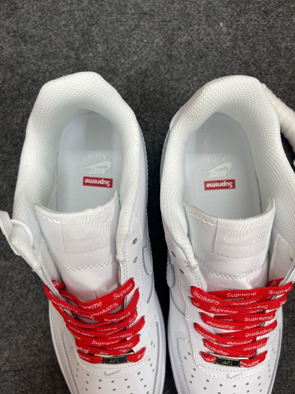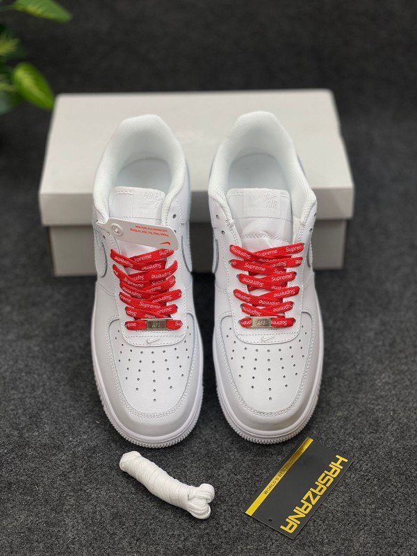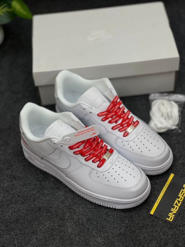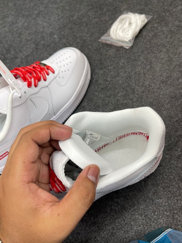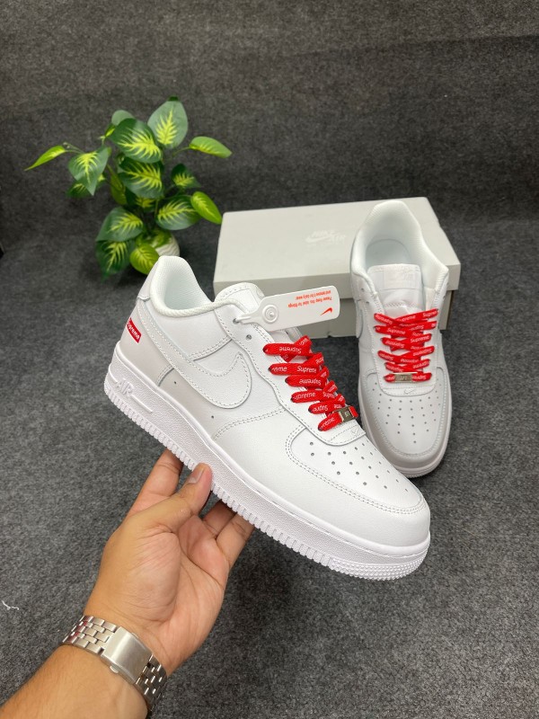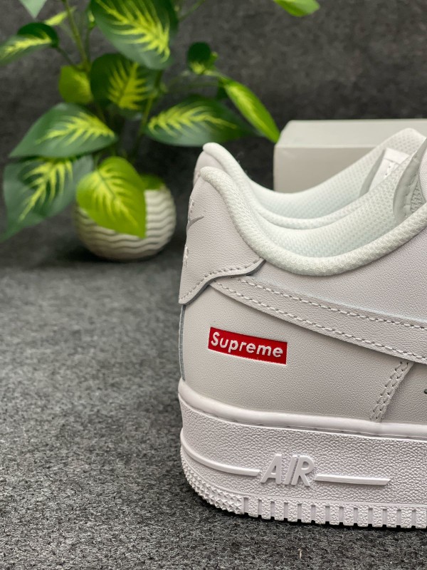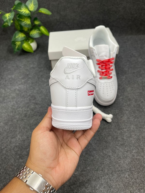 Dressed in a clean and crisp premium leather upper, the sneaker stays true to the original Air Force 1 design, with classic overlays, perforated toe box, and Nike Air branding on the heel and tongue. The real flex? A small red Supreme Box Logo stamped on the lateral heel—subtle yet powerful, making it instantly collectible.