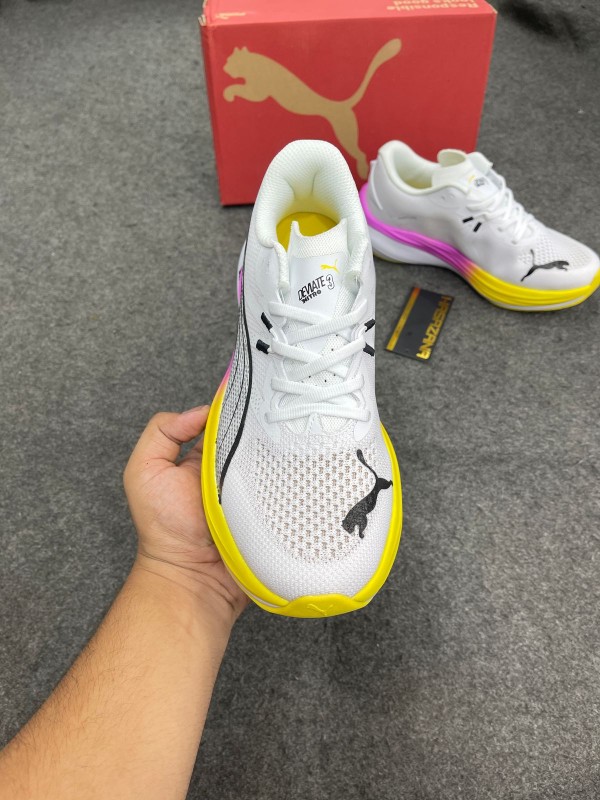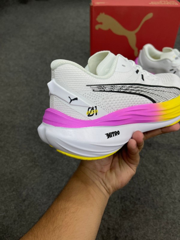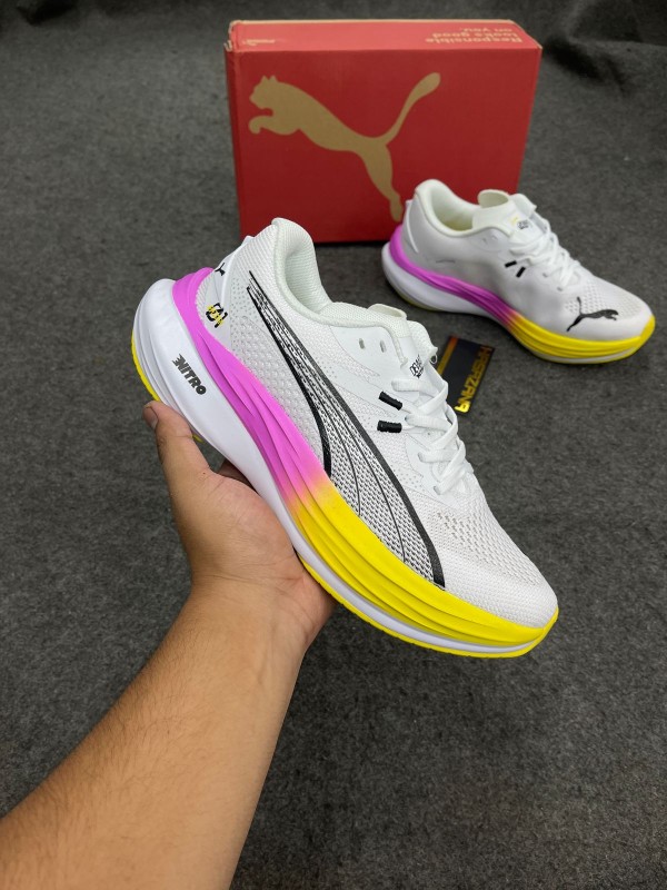 The upper features a lightweight, breathable engineered mesh in crisp White, accented by Pure Magenta and Neon Yellow highlights for standout style. A full-length NITRO™ Elite foam midsole provides ultra-responsive cushioning with incredible energy return, while the carbon composite PWRPLATE ensures powerful propulsion and a snappy toe-off.
