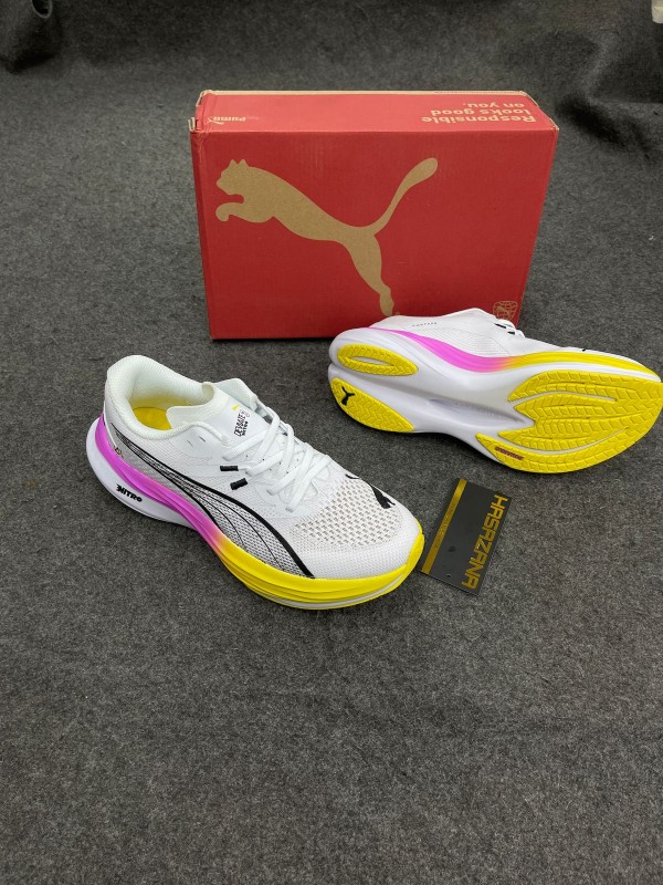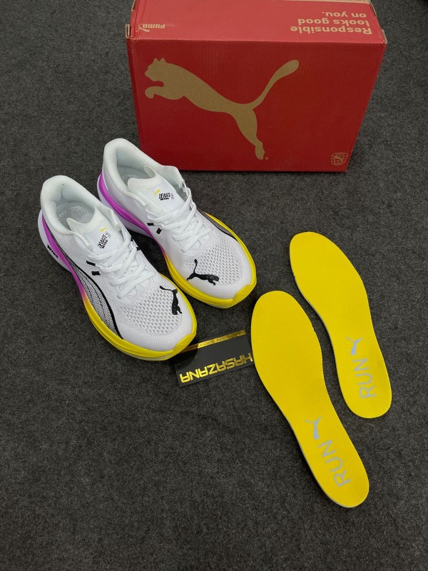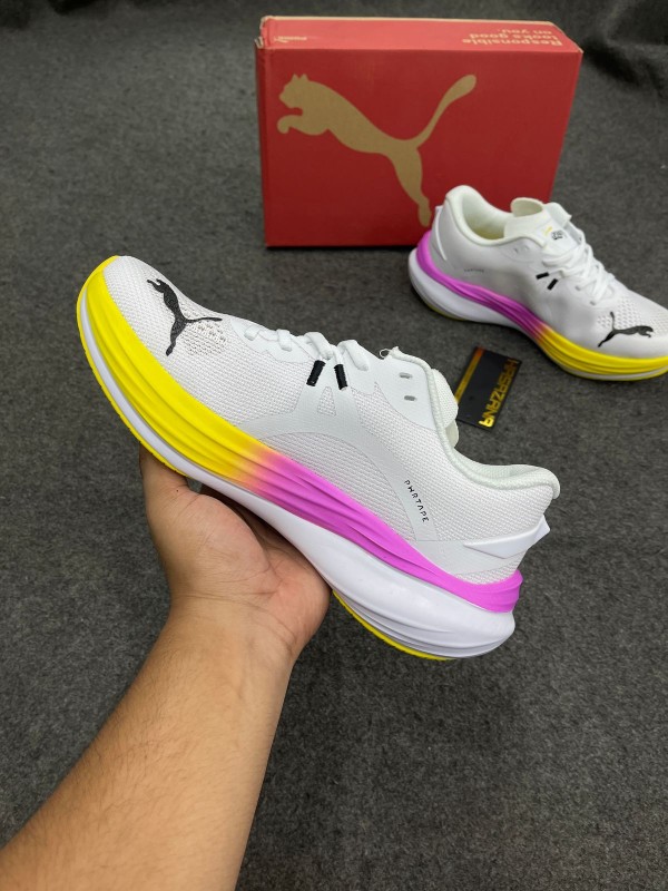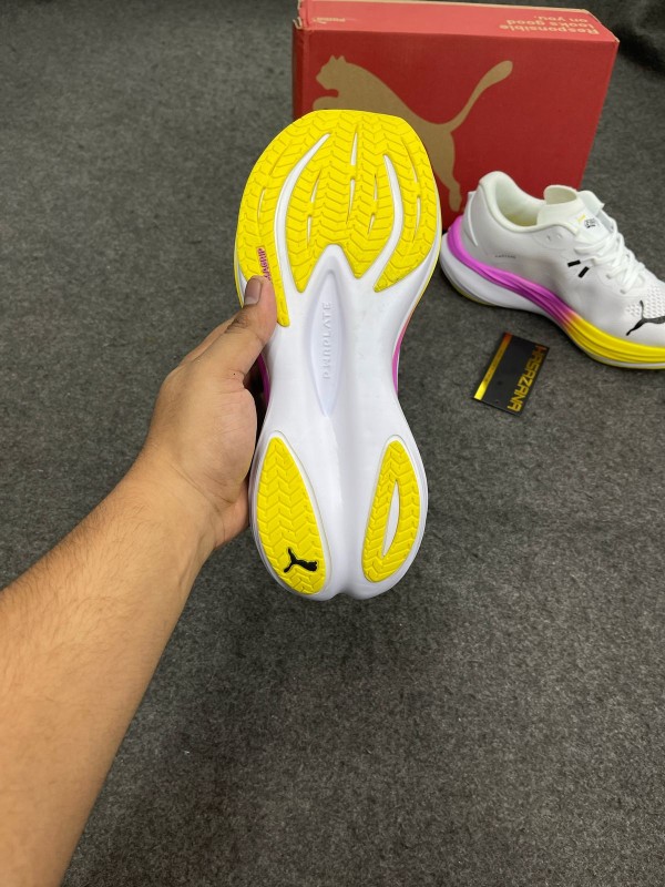 The asymmetrical design and sleek profile create a race-ready aesthetic, while the updated PUMAGRIP outsole offers enhanced traction on wet or dry roads. Strategically reinforced heel and arch support provide stability through high-mileage runs, and reflective details ensure visibility during early-morning or late-night miles.