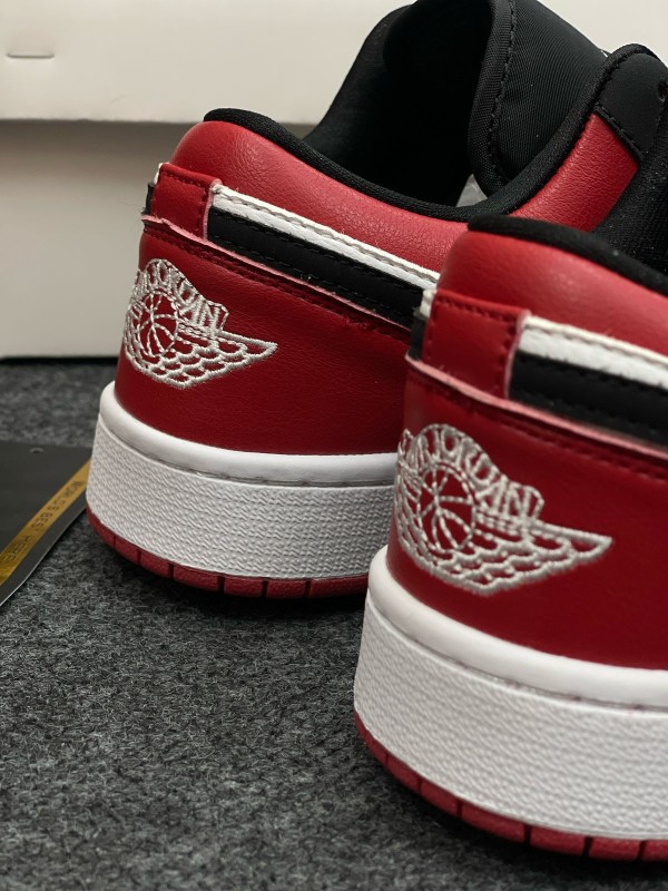 Crafted with a smooth white leather base, the shoe features contrasting black overlays at the forefoot and eyestays, while a bold Varsity Red heel and outsole infuse it with unmistakable Jordan DNA. The iconic black Swoosh, Jumpman logo on the tongue, and embroidered Wings logo on the heel complete the signature look.